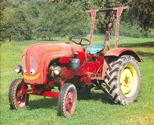 Dieser recht verspielt dreinschauender Acker-Porsche fällt mit seinem lustigen Gesicht zwangsläufig bei jeder Ausfahrt sofort auf. Der Traktor, der von dem Vorbesitzer auf den Namen Snoopy getauft wurde, ist einer der jüngeren, letzten Zugänge in unserer kleinen Sammlung. Die Kinder des Vorbesitzers hatten die Idee mit der “Kriegsbemalung”, wodurch der Traktor das lustige Gesicht erhielt. Der Lauf der Dinge war aber der, dass die Kinder inzwischen erwachsen und aus dem Haus sind, nur der Porsche - Traktor mit seinem Gesicht war immer noch da. Da der Vorbesitzer den Porsche aber schon lange nicht mehr nutzte, entschloss er sich, ihn zum Verkauf in einer Kleinanzeigenzeitung zu annoncieren, wo ich ihn entdeckte. Der Traktor ist, bis auf die “Sonderbeschriftung” nicht restauriert, aber in einem technisch sehr gut erhaltenen Zustand. Insgesamt erweckt er den Eindruck, dass er in seinem Leben nicht viel gelaufen ist. Ausser ein paar kleinen Roststellen vom langen Herumstehen (leider im Sommer teils in der prallen Sonne, wodurch manche Lackstellen ziemlich ausgeblichen matt sind) ist der sonstige Verschleiß nur sehr gering.