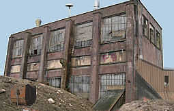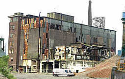 Fabrik-aussen 96: sehr große Halle, mit deren Abriss mal vor langem begonnen wurde, dann aber ließ man wohl von ihr ab