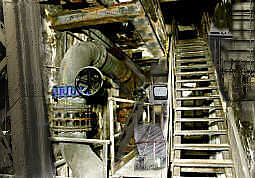 Man sieht aber deutlich, dass die Abrissarbeiten schon über 10 Jahre ruhen, weil auf den angehäuften Schutt- und Schrottbergen daneben bereits Unkraut und teils sogar kleine Sträucher und Bäumchen wuchern. Das Bild fabrik-außen101 zeigt einen Teilausschnitt einer seltsamen Galerie von 8 riesengroßen Öfen oder was das sein soll, die draußen im Freien stehen und über massive Rohrleitungen miteinander und mit Schächten im Erdboden verbunden sind.