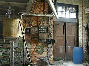 Diese Halle scheint nach meiner Meinung aus den 50iger Jahren zu stammen. Wir haben versucht zu ergründen, wozu diese wahnsinnig große Maschine diente, aber es ist uns nicht gelungen. Ich vermute, dass darin irgendwas erhitzt und zugleich gepresst wurde. Dieses große Rohr in der Mitte des Bildes, welches von oben nach unten und seitlich von der Maschine abzweigt, verläuft im Hof der Fabrik weiter, bis vorne in die ganz große alte Haupthalle der Fabrik.