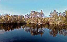 So entdeckt man neue Talente! Nun hatte ich Kayla mal die Digitalkamera überlassen und von den heutigen Fotos, die ich Ihnen beisteuere, hat sie, bis auf eines, alle geschossen. Sie hat da wirklich ein Händchen für, wie man so sagt und ich finde, ihre Bilder sind irgendwie besser, als meine eigenen, obwohl man an der Kamera ja nichts einstellen braucht und ich daher nicht so genau sagen kann, woran das liegt. Vielleicht hat sie einen besseren Blick für den Lichteinfall und das Motiv. Doch nun der Reihe nach und genauer. Bei unseren Erkundungen schien es sich in der vergangenen Woche wettermäßig nicht zu lohnen, weil der Regen kein Ende finden wollte, jedenfalls glaubten wir das zunächst. Aber gegen Mittwochmittag riss fast schlagartig die Bewölkung auf, binnen weniger Minuten verzogen sich alle Wolken und es herrschte schönster Sonnenschein. Wenn die Bäume nicht teils schon laublos oder mit gelbem Laub behangen wären, dann hätte man glauben können, es sei Frühling. Die Temperaturen blieben allerdings mit 7 Grad doch recht kühl. Wie ich schon mal erwähnte, wenn man bei uns am Haus nach vorne aus dem Fenster sieht, schaut man auf die kleine Straße hier und gegenüber auf der anderen Straßenseite folgen, so weit man blicken kann, ungleichmäßige Baumgrüppchen, Einzelbäume, etwas tiefer liegende Wiesen, dann wieder weiter hinten ungleichmäßige Baumansammlungen vorwiegend kleiner und mittelgroßer Bäume, Hecken und diverses Grünzeug ohne Plan wie man so sagt. Aber gerade das Ungeordnete mit seiner Vielfalt hat seinen Reiz. Wie weit reicht dort das Auge? Ich würde sagen etwa 250 m, das ist dann ungefähr in östliche Richtung, wenn man so will. Aber die große Frage blieb, was folgt dahinter, sozusagen hinter dieser letzten, ungeordneten Baumreihe am Ende der Wiesen? Nun, der Rentner war mal wieder hier, also ich meine den kurzatmigen Rentner hier aus der Siedlung, nicht den Mann aus Malsch, und der erzählte uns, dass hinter diesem grünen Horizont ein kleiner See folgen würde. Er meinte, dass man sich dort aber nicht von der scheinbaren Idylle trügen lassen soll, denn der See sei früher eine Sandgrube gewesen, die vielleicht 1953 geschlossen wurde. Danach habe man von dieser Fabrik hier und von einer längst abgerissenen kleinen Kalimine, die weiter südöstlich lag, ungefähr dort, wo heute der Militärauto - Schrottplatz ist, lange dicke Rohrleitungen weit über die Landschaft oder auch teils einfach am Erdboden liegend, bis in diese alte Sandgrube gelegt, um dort die angeblich harmlosen Abwässer der Betriebe einzuleiten. Das sei bis ungefähr 1975 auch so gemacht worden und wie harmlos die Abwässer wohl waren, hätte man damals daran bemerkt, dass dort im Umkreis von 200 m um den so künstlich entstandenen See nichts mehr gewachsen wäre, selbst kein Unkraut. Dafür habe es dort öfters eklig gestunken. Etwa 1975 wäre diese Mine ohnehin verschwunden und hier der Fabrik habe man untersagt, weiterhin dort Abwässer einzuleiten, wonach die meisten Rohrleitungen abmontiert wurden. Was dann keiner für möglich gehalten hätte, aber nur wenige Jahre später sei dort die Natur teils wunderschön zurückgekehrt. Er meinte, falls wir dorthin wandern, dann sollten wir trotzdem auf keinen Fall in das Wasser gehen, auch nicht mit den Füssen. Nun, bei den Außentemperaturen wäre man ohnehin nicht auf derartige Ideen gekommen. So sind wir also dorthin gewandert und wenn man das sieht, es ist wirklich ein Idyll ersten Ranges und man kann es nicht glauben, dass das ein Abwassersee sein soll. Sie sehen es auf dem Foto abwassersee und abwasserseeufer.