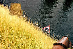 Abwasserseeufer: bei direkter Draufsicht wirkt das Wasser rabenschwarz, Verrückte hatten ein Verkehrsschild ins Wasser geworfen