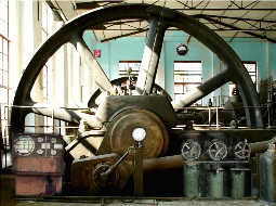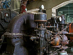 Das gilt dann gleich doppelt, weil in diesem außerordentlich gut erhaltenen Gebäudeteil zig wunderschöne große alte Maschinen herumstehen, von denen Sie eine auf dem von mir gemachten Foto fabrik-innen266 sehen. Zuerst glaubten wir, es handle sich um uralte Dampfmaschinen, weil die in etwa genau so aussehen, aber seitlich hängen noch Kontrolltafeln mit Messwerken, Schaltern und unzähligen Handrädern von Reglern und daran steht zugeordnet zu den einzelnen Maschinen immer die Beschriftung „Saugluft- Kompressor I ..... u.s.w. durchnummeriert bis VII" Also insgesamt 7 riesige Kompressoren uralter Bauart sind das wohl.