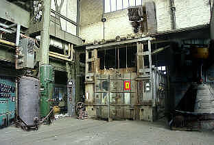 Die Frage war nur, wie kriegt man das Gebilde auf? Der Ofen hatte doppelte Türen, eine erste Lage Türen, die man einfach aufschwenken konnte, aber direkt dahinter waren noch dickere Türen. Diese Ofentüren bestanden aus dicken Eisentafeln, die von der Innenseite mit Schamottsteinen ausgemauert waren und die mittels Seilzügen und Umlenkrollen von einer Art elektrischer Seilwinde nach oben gezogen wurden, wonach sich dann der Ofeninnenraum freigab. Aber hier war ja kein Strom mehr und per Muskelkraft diese schweren Türen aufziehen, wäre völlig unmöglich. Kayla wollte sich mit diesem Argument aber nicht abfinden. Sie vertrat den Standpunkt, dass solche Anlagen sicherlich auch eine Art Sicherungssystem hätten, mit dem man in einem Notfall auch bei Stromausfall den Ofen aufbekommt. Na die hat gut reden, dachte ich. Währenddessen inspizierte sie diese Seilzüge ganz genau, wo die entlang laufen und wo die elektrische Winde dafür sitzt. Und was soll ich Ihnen sagen, Kayla hatte den richtigen Riecher! Rechts an der Seitenwand des Ofens, auf dem Foto schon mehr im Halbdunkel verschwindend, ist ein Aufsteckdorn für eine Kurbel wo auch sogar ein Aufkleber mit der Beschriftung „Notbetätigung" an heftete. Jetzt fehlte uns nur noch die passende Kurbel, aber die hatte sicherlich ein Sammler längst mitgenommen, dachte ich. Aber nein, links neben dem Ofen folgt ein schmaler Gang nach hinten, wo eine Art Meisterbude oder Meisterbüro ist, dort hing eine passende Kurbel in einem Halter an der Wand. Wir haben gekurbelt wie die Weltmeister und um die schweren Türen mit Muskelkraft hochzukurbeln ist da eine Übersetzung drin, sonst würde man das nie schaffen, diese Übersetzung ermöglicht das zwar, allerdings braucht man über 10 Minuten des Kurbelns, bis diese Türen soweit hochgekurbelt sind, dass man den Ofen begehen kann. Neben der Freude folgte dann auch eine kleine Ernüchterung. Der Ofen ist zwar riesig, aber vermutlich haben die damals beim Abschalten der Fabrik, den Ofen einfach ausgeschaltet, obwohl noch Material darin war, so dass er zu Dreiviertel mit verhärteten Schlackeresten oder solch ähnlichem Zeug voll ist. Auf war er und wir ließen ihn gleich auf, um wenigstens den Freiraum, der geblieben war, am nächsten Tag mit alten Gussformen voll zu stopfen. Unser Rundgang endete hier aber noch längst nicht, da dort unmöglich alle Gussformen reinpassten. Im gleichen Hallenteil, vielleicht 40 m weiter nach links, stießen wir dann auf einen ähnlichen Ofen, der aber doch etwas anders aufgebaut ist. Er verfügt nur über eine zweiflügelige Schwenktür, deren beiden Türteile dafür aber mindestens dreifach so dick sind, wie Türen des ersten Ofens. Trotz der Schwere und Größe dieser Türen, die etwas an einen Staatstresor erinnern, konnte man die mit einer als Brecheisen zweckentfremdeten Eisenstange mit viel Anstrengung aufhebeln. Auch hier waren wir ein wenig enttäuscht, nicht wegen irgendwelcher Reste, sondern weil der Ofen innen so dick mit Schamott ausgemauert ist, dass die wahre Innengröße bestenfalls noch 40 % der Außengröße ausmacht. Egal, auch diese Türen ließen wir schon mal für den Folgetag offen. Angebaut an die nächste Halle, halb im Freigelände, zwar überdacht, aber an der Westseite ohne Wand, stießen wir dann auf eine Batterie von ganz anderen Bauformen von Öfen, die vermutlich für chemische Abläufe notwendig waren. Ein Foto von diesen folgt später mal, da der Akku unserer Kamera ab dann leer war. An diesen schmäleren, aber dafür sehr hohen Öfen, die mindestens 7 bis 10 m Höhe aufweisen, befinden sich halb abmontierte dicke Rohrleitungen, die einmal in den Ofenschlund führten. Der Durchmesser dieser Rohrschlünde liegt schätzungsweise bei 1 m. Ich vermute, dass über diese Rohrleitungen früher Gas oder Luft unter Druck zugeführt wurde. Dadurch, dass diese Rohrleitungen zu dem Ofenschlund schon halb abmontiert und beweglich aufgehängt sind, stehen die Mäuler der ersten 4 Öfen offen und auch darin ließen sich mit einigen Verrenkungen sicher etliche Gussformen versenken. Zufrieden gingen wir nach Hause und an dem Tag früh zu Bett, um am Folgetag in aller Frühe wieder mit erneutem Tatendrang und frischer Kraft loszulegen. Donnerstag, den 30. November, um punkt 4.45 Uhr standen wir wieder auf und gegen 5.30 Uhr waren wir wieder im Einsatz. Das Wetter spielte zum Glück einigermaßen mit. So gelang es uns, bis Mittag die neben der Schlacke gebliebenen Freiräume des Fabrik- Ofens1 restlos mit alten Gussformen auszufüllen. Es passten auf diese Weise exakt 98 Gussformen hinein. Kayla zählte immer mit. Gemessen am Gesamtbestand noch nicht wirklich viel, vielleicht ein Zehntel oder mit etwas Glück ein Neuntel aller Formen. Dann kurbelten wir die großen Ofentüren wieder runter, nahmen sinnvoller Weise die Kurbel mit nach Hause und wandten uns dem zweiten Ofen zu. Da man in den sehr weit reinklettern konnte, gelang es uns, nach einer ausgedehnten Mittagspause in den Fabrik-Ofen2 immerhin exakt 169 Gussformen zu stapeln. Ich wollte noch eine 170te dazu schmeißen, aber dann gingen die Türen nicht mehr richtig zu. Nachdem dieser Ofen also auch randvoll war, zeigte die Uhr inzwischen 18.30 Uhr und wir beschlossen, für diesen Tag aufzuhören. Natürlich waren wir wieder ganz schön ausgelaugt, aber nicht ganz so schlimm, wie am ersten Montag. Eine frische Dusche belebte uns wieder etwas und bereits am Freitag, den 1. Dezember, ging es weiter. Nicht ganz so früh, aber immerhin um 7 Uhr standen wir bereits wieder in der Fabrik und bestückten nun die erwähnten 4 chemischen Öfen mit unserem Zeug. Da die Ofenlöcher hier aber zum Befüllen mit schweren Teilen sehr ungünstig hinter den alten Rohrleitungen liegen, war es immer eine ungelenke Wuchterei, die unhandlichen Gussformen dort hinein zu werfen. Danach sahen meine Fingerkuppen trotz dicker Arbeitshandschuhe auch ziemlich lädiert aus, weil die öfters dazwischen gerieten. Durch die ung