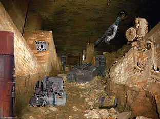 So schlenderten wir erneut über das Gelände und durch viele der alten Hallen, aber ausschließlich durch solche, die nicht weiter, als vielleicht 150 m von unserer Grundstücksgrenze entfernt liegen. Als wir gerade draußen im Fabrikhof umherliefen, vernahmen wir plötzlich das Geräusch eines herannahenden Fahrzeugs. Wir sahen dann, dass jemand das Haupteinfahrtstor der Fabrik aufgeschlossen hatte, es stand bereits weit offen und ein weißer VW - Passat sowie ein bronzefarbener Mercedes fuhren auf dem Gelände bis vor die erste Haupthalle. Wir beobachteten das aus einem sicheren Versteck vom Fenster einer kleinen Nebenhalle aus. Einige Herren sowie eine Dame stiegen aus den Fahrzeugen aus und entrollten auf der Motorhaube des Passat große Baupläne, dann diskutierten die Leute untereinander, wobei immer auf die besonders gut erhaltene, hohe Haupthalle gezeigt wurde. Angst vor Entdeckung brauchten wir nicht wirklich zu haben, denn das Gelände ist so weitläufig und groß, wenn man sich da ein wenig auskennt, und das tun wir inzwischen, gibt es so viele Möglichkeiten sich zu verstecken, dass die paar Leutchen da überhaupt keine Chance hätten, einen zu finden. Das Problem war aber, dass wir keine Lust hatten, hier vielleicht sinnlos viele Stunden zu verweilen, bis dass es denen einfiel, wieder zu verschwinden. So war unser Ansinnen, möglichst schnell und unauffällig bis zu der Tür in der Fabrikmauer zu gelangen, um wieder auf unser Grundstück zu kommen. Das hingegen war gar nicht so einfach, da die genau vorne an der rechten Ecke der Haupthalle standen, wo man automatisch den Blick genau auf den Mauerteil richtet, der an unser Grundstück grenzt. Wären wir dort entlang gelaufen, hätten die uns zwangsweise sehen müssen, ob sie gewollt hätten oder nicht. So warteten wir zunächst ab, um zu sehen, was die weiter machten. Man konnte von weitem gut erkennen, dass die plötzlich in ziemlich heftige Diskussionen verfielen. Nach einer Weile verschwanden die dann unten in der Haupthalle. Das war unsere Chance, wenngleich wir wussten, dass man von den nordöstlichen Fenstern der Haupthalle einen vorzüglichen Blick auf „unsere" Mauer hat. Wir wussten ja nicht, wo die sich innerhalb der Haupthalle aufhielten. Unsere Überlegung war aber die, dass wenn wir sofort loslaufen und durch die Tür wieder auf unser Gelände verschwinden, dann wäre das unsere beste Chance unentdeckt zu bleiben, weil diese Leute sich in der kurzen Zeit sicherlich noch im Erdgeschoss der Halle befanden, von wo aus es keine gute Übersicht aus den Fenstern in Richtung unserer Mauer gibt, weil davor noch einige niedrige Bauten stehen, die ungefähr so hoch wie normale Garagen sind. Die gute Übersicht hat man nur ab dem ersten Stockwerk und höher oder halt von draußen. So haben wir unsere schöne Handkarre in der kleinen Halle hinter einer alten Maschine deponiert, da eine „Flucht" mit der Karre zweifellos zu auffällig gewesen wäre und sind sofort rüber zur Tür gelaufen und auf unser Grundstück gehuscht. Es ist auch gut gegangen und keiner hat es bemerkt. Die Karre haben wir dann abends geholt, als die wieder weg waren. Diese Leute blieben tatsächlich den ganzen Nachmittag dort und so war es uns nicht möglich, weiter nach brauchbaren Stellen zu suchen - dachten wir. Unverhofft kommt oft, lautet ein alter Spruch und ein weiterer Spruch lautet: Warum in die Ferne schweifen, wenn das Gute liegt so nah. Wir sind fast blöde geworden, man kann es ruhig so nennen, denn als wir noch am gleichen Nachmittag in unserem Garten ein wenig alte Äste und solches Zeug entlang der Mauer zum Werksgelände entfernten und auf einem Haufen zusammentrugen, stieß ich am Erdboden, vielleicht 10 m von der Mauer entfernt, also in unserem eigenen Garten, auf einen großen Eisendeckel mit 4 Handgriffen dran. Wir entfernten den Dreck von dem Deckel und hoben ihn gemeinsam an. Darunter tat sich ein weiteres altes Kellergewölbe auf. Schnell war eine Leiter herangeschafft und wir besichtigten das Gewölbe mit unseren Taschenlampen. Was sich uns dort auftat, sehen Sie zu einem sehr kleinen Teil auf dem Foto garten-keller. Halb zerstörte Mauerwerksreste von alten Gebäudekellern, Kellerhallen, teils noch mit zerfallenen Zwischentreppen, teils verschimmelte Räume, Reste von alten Anlagen und Maschinen oder Installationen, also ich würde sagen, dieses geheime Reich erstreckt sich bis zu 40 % unter unserem Garten und scheint auch unter der Fabrikmauer durchzugehen, bis auf das Gelände der Fabrik.