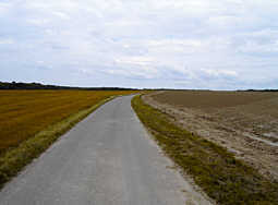Im Hintergrund, nach der seichten Rechtskurve, sieht man leicht einen kleinen Wald beginnen, dort bekommt diese kleine Straße ein ziemliches Gefälle und verläuft dann in ein paar Kurven unweit an der stillgelegten Bahnstrecke und dem stillgelegten Bahnhof vorbei, um dann von dort wieder leicht etwas nach Westen zu verschwenken und zu unserer Siedlung zu führen. Eine herrlich ruhige Ecke!