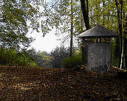 In der Fläche wirkt das Wasser eher blau, sofern sich der blaue Himmel darin spiegelt, wenn man aber richtig von oben in das Wasser schaut, dann wirkt es rabenschwarz, was man auf dem Foto vom Ufer auch gut erkennt. Ebenso ungewöhnlich fanden wir die nahezu grellgelbe Farbe des leicht vertrockneten Grases am westlichen Ufer des Teichs, die man auf dem Foto abwasserseeufer auch sehr gut erkennt. Vielleicht liegt es aber auch nur an der Grassorte, die dort wächst, dass die im Herbst so leuchtend gelb abstirbt, aber Gras bleibt doch eigentlich immer grün, außer wenn es vertrocknet. Vertrocknet es, dann wird es jedoch bräunlich und nicht grellgelb, fast schon neongelb und vor allem hier diese Gräser sehen gar nicht vertrocknet aus, sondern als stünden sie nach wie vor im Saft, aber eben grellgelb. Dieses Grellgelb bildet natürlich einen wunderbaren Kontrast zum nahezu schwarzen Wasser des Sees. Beim Anblick des schwarzen Wassers meinte Kayla schon, das Wasser sieht genau so aus, wie das ebenfalls schwarze Wasser in dem Klärbecken der Fabrik, auf welches wir vor ungefähr einem Monat vom höchsten Hallengebäudedach der alten Fabrik schauten. Nichtsdestotrotz ist der See eine sehr schöne Anlage und wir sind erneut hocherfreut, solch ein idyllisches Plätzchen in unserer Nahumgebung zu haben. Am Rande des Sees lagen verstreut einzelne alte Stroh - Rundballen, die teils schon zerfielen. Ob ein Landwirt dort seine unbrauchbaren Strohreste entsorgt hat, scheint mir eher unwahrscheinlich. Übrigens, wussten Sie schon das Verkehrsschilder schwimmen können? Eine gewiss ungewöhnliche Frage, die mir zeitlebens nicht eingefallen wäre, aber im Randbereich schwamm ein abgerissenes Verkehrszeichen, sinnigerweise vom Typ „Schleudergefahr" im Uferbereich. Vermutlich wurde es mal von Vandalen dort reingeworfen, auf die man aber ansonsten hier in der Gegend nur selten trifft. Auch ein altes, rostiges Zulaufrohr sehen Sie auf dem Foto noch, welches in die Tiefe des Sees führt. Rund 50 m vor dem See kommt dieses Rohr weiter oben aus dem Erdboden, um dann ab dort in den See zu verlaufen. Woher dieses Rohr genau kommt lässt sich so aber nicht mehr nachvollziehen. Vielleicht kommt es sogar unterirdisch aus „unserer Fabrik". Zu Fuß geht man von unserem Haus etwas länger als 10 Minuten über einen schmalen Feldweg, der sich zwischen den oben angesprochenen Wiesen in östliche Richtung hinzieht, bis man an diesem See ist. Auf dem Foto wirkt der See augenscheinlich größer, als er wirklich ist. Man kann ihn zu Fuß innerhalb von weniger als 15 Minuten komplett umrunden und das bei gemütlicher Gangart. Dabei ist die vom Fotostandort gegenüberliegende Seeseite, die Ostseite, aber leider nicht direkt am Ufer begehbar, weil die dortigen Bäume tief im Wasser stehen. Der Weg führt dort ein Stück hinter diesen Bäumen oder besser gesagt zwischen den selben entlang. Nur in einem Bereich am südlichen Ufer des Sees, das wäre auf dem Foto rechts, drang irgendwoher ein wenig penetranter Gestank, der uns auf Anhieb wieder an den stechenden Geruch in der alten, teils verfallenen Halle der Ammoniakproduktion der Fabrik erinnerte. In dem gleichen Bereich konnte man auch noch am Boden diverse Stümpfe und Reste alter großer Rohrleitungen entdecken, die teils noch auf stabilen Betonsockeln montiert waren. So kann man davon ausgehen, dass es dort durchaus noch gewisse Altlasten gibt. Es ist immer wieder erstaunlich, wie sich demnach die Natur auch ehemals verseuchte Gebiete zurück holt und sie wieder in ein Erholungsgebiet verwandelt. Diesen hübschen, aber auch vielleicht nicht ganz ungefährlichen See haben wir gleich 2 mal umwandert. Danach sind wir dann über einen relativ gut ausgebauten Feldweg gewandert, der von diesem See östlich gelegen im Hinterland dann in südliche Richtung weiter verläuft. Dieser Weg führt an langen Feldern vorbei und dann weiter hinten in das kleine Waldstück, in welches wir vor einigen Wochen von der Vorderseite neben dem Militär - Schrottautogelände gegangen waren, wo auch dieser ungewöhnliche riesengroße Trichter neben einem kleinen Gebäude aus dem Boden ragt. In diesem gleichen Waldstück befanden wir uns jetzt, allerdings deutlich weiter östlich. Da wir keine Lust hatten, den gleichen langen Weg am See vorbei zurück zu gehen, den wir gekommen waren, beschlossen wir, in diesem Wäldchen einfach querfeldein, oder querwaldein müsste man hier sagen, zu wandern, da wir davon ausgingen, dass wir dort dann wieder auf einen Waldweg stoßen, der letztendlich irgendwo wieder auf die Straße führt, an der auch unser Haus steht. So hätten wir dann gewissermaßen eine Kreiswanderung unternommen. In dem besagten Waldstück, stießen wir dann nicht auf einen weiteren Waldtrichter, aber dafür auf einen, nennen wir es einfach einen Wald-Hut. Dort ragt ein dickes Metallrohr mit einem Durchmesser von rund 2 m bis in eine Höhe von etwa 3 m aus dem Boden, welches oben eine Art Metall - Hut als Schutzkappe trug. Im Prinzip wie ein überdimensionaler Blechkamin, ragt dieses Ding dort aus dem Boden, also im gleichen Waldstück, wo auch der Betontrichter aus dem Boden ragt, nur befindet sich dieser Wald-Hut - Blechkamin viel abgelegener weiter östlich. Sie sehen das Ding auf dem Foto wald-hut.