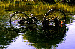 see-rad: ein ehemals hochwertiges Rad über Kopf versenkt im Uferbereich des Abwassersees