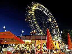 Kayla machte dann gleich am ersten Tag den Vorschlag, dass wir Wien auch bei Nacht mal erkunden müssten. So haben wir das dann auch gemacht. Bei beginnender Dämmerung brachen wir erneut bewaffnet mit unseren beiden Digitalkameras auf. Meine eigene Digitalkamera brachte aber schon bei der beginnenden Dämmerung keine brauchbaren Ergebnisse mehr zustande. Ganz anders Kaylas schöne Minolta. So entstanden unter diesen Dämmerungsbedingungen einige fast schon künstlerisch wertvollen Aufnahmen. Was einfach zu einem Wienbesuch unbedingt dazu gehört, ein Praterbesuch aber halt hier mal zur Abwechslung bei Nacht. Aufnahme wien027 fotografiert hinter dem Riesenrad. Wir sind bei der Gelegenheit auch mit dem Riesenrad in der Dämmerung mal gefahren und es ist einfach wieder ein völlig anderes und unbedingt empfehlenswertes Erlebnis, als wie bei Tage. Wenn man so auf die erleuchtete Stadt schaut, einfach herrlich.