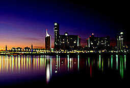 wien100: von einer Stelle am Donauufer nach fast vollzogener Dämmerung zur Stadt geblickt