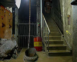 Fabrik-keller062: eine Treppe nach oben und ein Schacht nach unten