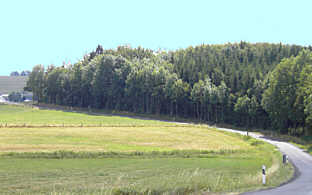 Dieser recht stattliche Weiher wird von alten, stabilen Sandsteinmauern umfasst, die teils schon selbst bewachsen sind, aber eine längs neben dem Weiher befindliche Rasenfläche wird wohl heute noch gepflegt, denn die war eindeutig frisch gemäht, was man auch auf dem Bild bei genauer Betrachtung grob erkennt. Dieser Weiher ist schätzungsweise 20 m breit und 200 m lang. In welchem Zusammenhang der Weiher und die Ruine stehen, weiß ich nicht, aber einen Zusammenhang muss es wohl geben. Da hinter der Ruine wegen der Schlucht kein Fortkommen mehr war, änderten wir unsere Wanderrichtung wieder von südlich mehr in westlich um, und gelangten dann entlang des Weihers vielleicht in einem knappen Kilometer Entfernung auf eine hübsche kleine Landstraße, die Sie auf dem Foto Landstraße6 sehen. Es wurde jedoch relativ schnell sehr schwül an dem Tag und Kayla meinte, dass sich offensichtlich heftige Gewitter zusammenbrauen würden.