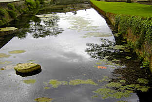 Kayla meinte gleich, dass es vermutlich die Reste einer alten Kirche oder eines ähnlichen Bauwerks sein dürften. Dicht umwachsen von kräftigen Laubbäumen und direkt hinter dem Gebäuderest geht es etwa 20 m schluchtartig in die Tiefe, wo dann unten ein kleiner, idyllisch schöner Wildbach im dunklen Wald daher fließt. Rund 150 m vor dieser Ruine befindet sich links ein wohl früher mal künstlich angelegter Weiher, den Sie auf dem Bild weiher1 sehen.